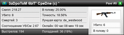 | 04.05.2018 @ 09:07 - 09:10 | de_westwood | 00:03:15 | 5 | 0 | 0 | 0.00% | 15.50% | 155.58 |