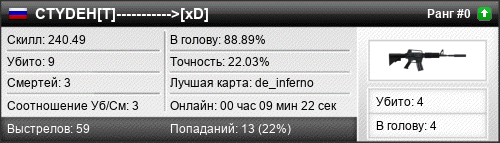 | de_inferno | 9 | 3.00 | 0.97 | 2 | 6 | 00:09:19 | 08.05.2018 | |