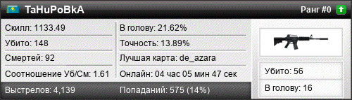 | 13.05.2018 @ 21:11 - 22:20 | de_mirage | 01:08:33 | 45 | 25 | 8 | 17.78% | 13.91% | 778.10 |