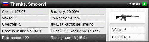 | de_inferno | 5 | 1.00 | 0.61 | 1 | 5 | 00:08:13 | 10.12.2015 | |