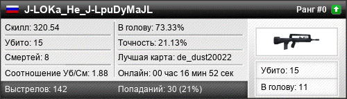 | de_dust20022 | 15 | 2.14 | 0.96 | 1 | 11 | 00:15:40 | 25.05.2018 | |