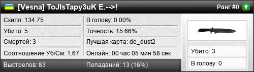 | de_dust2 | 5 | 2.50 | 1.13 | 1 | 5 | 00:04:26 | 29.05.2018 | |