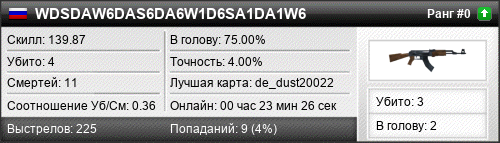 | de_dust20022 | 4 | 0.40 | 0.22 | 1 | 11 | 00:18:09 | 02.06.2018 | |