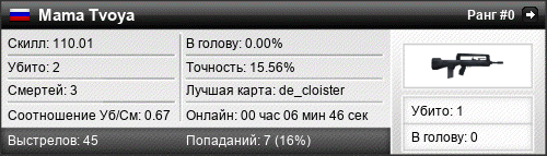 | de_cloister | 2 | 0.67 | 0.30 | 1 | 5 | 00:06:46 | 23.10.2015 | |