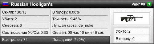 | 27.05.2020 @ 14:30 - 14:31 | de_westwood | 00:01:03 | 0 | 1 | 0 | 0.00% | 0.00% | 130.13 |