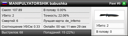 | de_inferno | 2 | 0.40 | 0.21 | 1 | 6 | 00:09:36 | 13.07.2018 | |