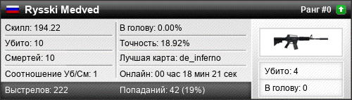 | de_inferno | 9 | 1.29 | 0.60 | 1 | 9 | 00:14:59 | 13.12.2015 | |