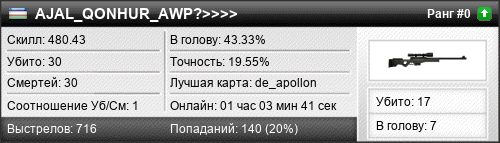| de_apollon | 16 | 1.45 | 0.67 | 1 | 15 | 00:23:53 | 19.07.2018 | |