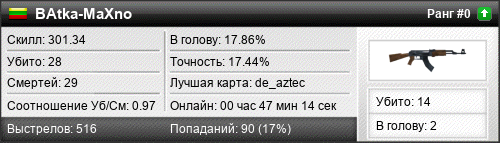 | de_aztec | 19 | 1.58 | 1.01 | 2 | 17 | 00:18:44 | 31.07.2018 | |