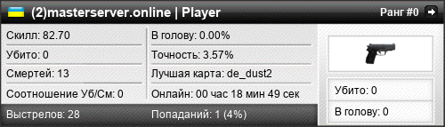 | 26.01.2019 @ 08:50 - 08:56 | de_dust2 | 00:06:17 | 0 | 4 | 0 | 0.00% | 0.00% | 85.73 |