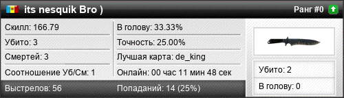 | de_king | 2 | 1.00 | 0.66 | 1 | 2 | 00:03:01 | 10.08.2018 | |