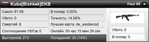 | 26.08.2018 @ 10:25 - 10:30 | de_westwood | 00:04:34 | 0 | 3 | 0 | 0.00% | 7.81% | 93.69 |