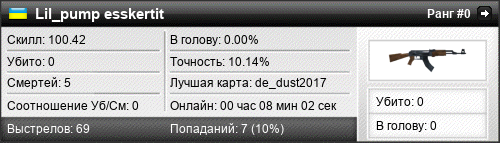 de_dust2017 | 0 | 0.00 | 0.00 | 1 | 6 | 00:08:02 | 30.08.2018 |