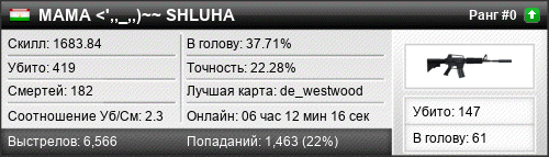 | de_nuke | 21 | 1.24 | 0.65 | 6 | 22 | 00:32:04 | 13.09.2018 | |
