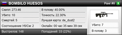 | de_dust2 | 10 | 2.00 | 0.72 | 1 | 10 | 00:13:58 | 12.09.2018 | |