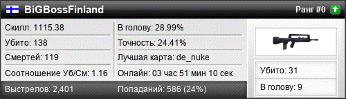 | de_nuke | 36 | 1.57 | 0.72 | 3 | 32 | 00:50:06 | 12.06.2019 | |