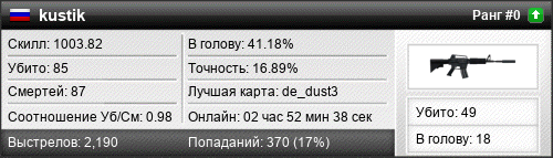 | de_dust2 | 9 | 1.29 | 0.45 | 2 | 14 | 00:19:52 | 03.01.2023 | |