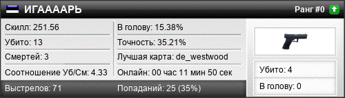 10.10.2018 @ 02:23 - 02:34 de_westwood 00:10:40 13 2 2 15.38% 45.45% 253.59 Разница: +74.22