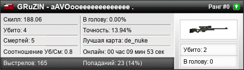 | de_nuke | 4 | 1.33 | 0.63 | 1 | 4 | 00:06:23 | 15.10.2018 | |