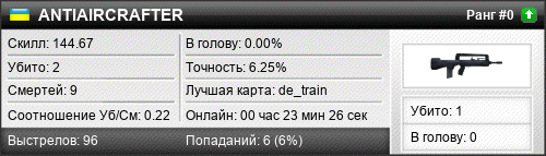 | 23.12.2018 @ 02:03 - 02:10 | de_train | 00:07:04 | 1 | 3 | 0 | 0.00% | 3.92% | 144.95 |