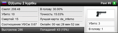 | de_inferno | 8 | 0.80 | 0.36 | 1 | 12 | 00:22:05 | 23.10.2018 | |