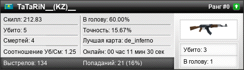 | de_inferno | 4 | 1.33 | 0.48 | 1 | 7 | 00:08:18 | 27.10.2018 | |