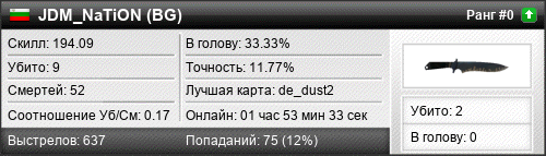 | 27.07.2019 @ 01:12 - 01:17 | de_mirage | 00:04:20 | 0 | 2 | 0 | 0.00% | 20.00% | 198.91 |
