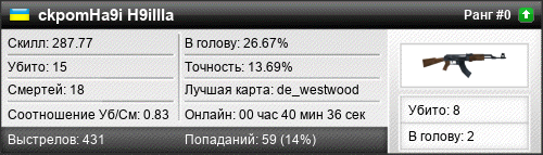| de_westwood | 7 | 1.17 | 0.47 | 1 | 10 | 00:14:45 | 08.11.2018 | |