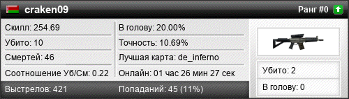 | de_inferno | 4 | 0.20 | 0.10 | 2 | 23 | 00:38:38 | 07.11.2018 | |