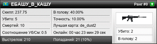 | 07.11.2018 @ 05:55 - 06:11 | de_dust2 | 00:15:52 | 2 | 7 | 0 | 0.00% | 6.90% | 161.00 |