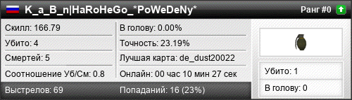 | 08.11.2018 @ 02:04 - 02:09 | de_aztec | 00:04:33 | 1 | 3 | 0 | 0.00% | 18.18% | 106.94 |