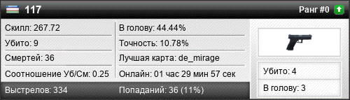 | de_mirage | 4 | 0.33 | 0.18 | 1 | 17 | 00:22:11 | 27.01.2019 | |