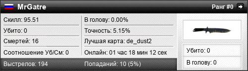 | de_dust2 | 0 | 0.00 | 0.00 | 1 | 1 | 00:00:49 | 27.11.2018 | |