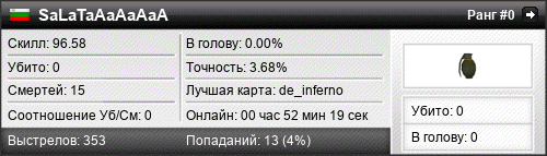 | 20.11.2018 @ 21:55 - 22:02 | de_inferno | 00:06:29 | 0 | 3 | 0 | 0.00% | 6.98% | 99.87 |