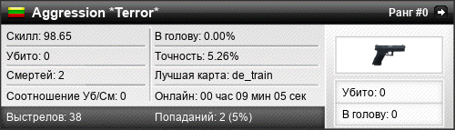 | 06.12.2018 @ 03:33 - 03:36 | de_train | 00:02:49 | 0 | 1 | 0 | 0.00% | 5.00% | 98.65 |