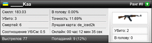 | 25.12.2018 @ 00:24 - 00:29 | de_iced2k | 00:05:33 | 2 | 3 | 0 | 0.00% | 10.96% | 175.96 |