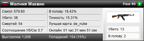 | de_nuke | 13 | 0.81 | 0.44 | 1 | 19 | 00:29:27 | 05.04.2021 | |