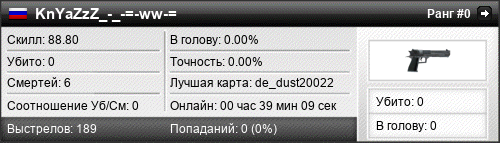 | 21.12.2018 @ 17:49 - 17:54 | de_dust20022 | 00:05:05 | 0 | 0 | 0 | 0.00% | 0.00% | 88.80 |