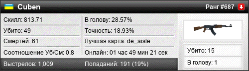 de_dust2 | 4 | 0.36 | 0.19 | 2 | 15 | 00:21:32 | 02.10.2025 |