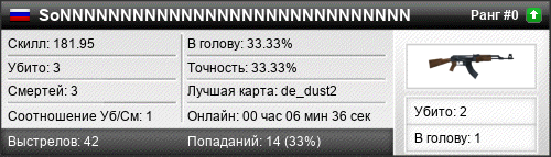 | de_dust2 | 3 | 1.50 | 0.89 | 1 | 3 | 00:03:23 | 03.01.2019 | |