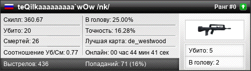 | de_westwood | 15 | 0.88 | 0.58 | 3 | 21 | 00:26:00 | 06.02.2019 | |