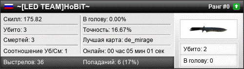 | de_mirage | 3 | 1.00 | 0.63 | 1 | 5 | 00:04:46 | 14.01.2019 | |