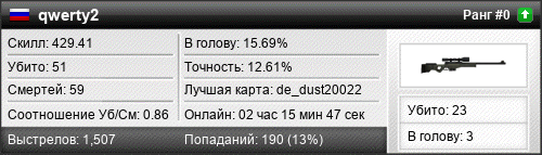 | de_badcore | 8 | 1.33 | 0.43 | 2 | 12 | 00:18:41 | 08.04.2016 | |