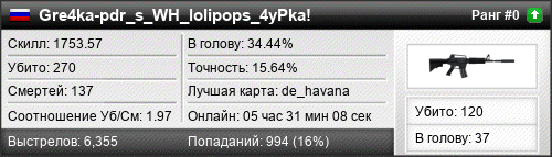 | de_havana | 44 | 2.93 | 1.30 | 2 | 22 | 00:33:54 | 04.02.2019 | |