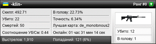 | 12.02.2019 @ 14:20 - 14:48 | de_anomalous | 00:27:49 | 10 | 18 | 1 | 10.00% | 10.42% | 492.71 |