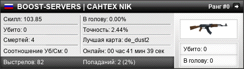 | 16.04.2019 @ 08:49 - 08:54 | de_dust2 | 00:04:57 | 0 | 2 | 0 | 0.00% | 1.54% | 103.85 |