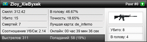 | 05.03.2019 @ 08:37 - 08:49 | de_inferno | 00:11:42 | 15 | 4 | 7 | 46.67% | 18.65% | 312.42 |