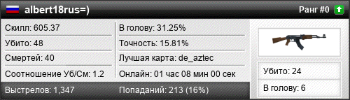 | 11.03.2019 @ 05:36 - 06:27 | de_aztec | 00:50:26 | 25 | 21 | 11 | 44.00% | 12.49% | 378.75 |