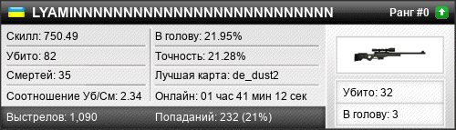 | de_inferno | 19 | 3.17 | 0.77 | 3 | 18 | 00:24:34 | 18.03.2019 | |