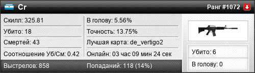 de_mirage | 4 | 1.33 | 0.12 | 1 | 21 | 00:33:30 | 04.06.2018 |